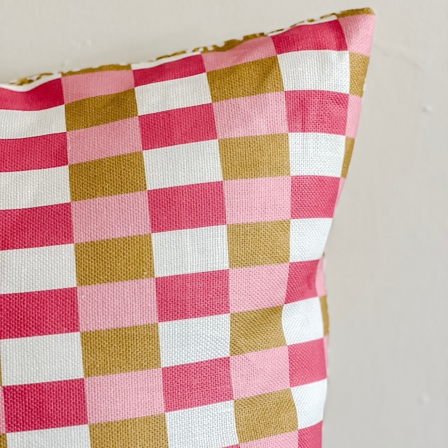 The beautiful Picnic Check fabric by Australian designer Sarah Drayton in raspberry and caramel tones, has been combined with an equally beautiful fabric by Ash Block Printing, Asanoha in chartreuse. These two 100% linen fabrics come together to create a simply stunning cushion cover.